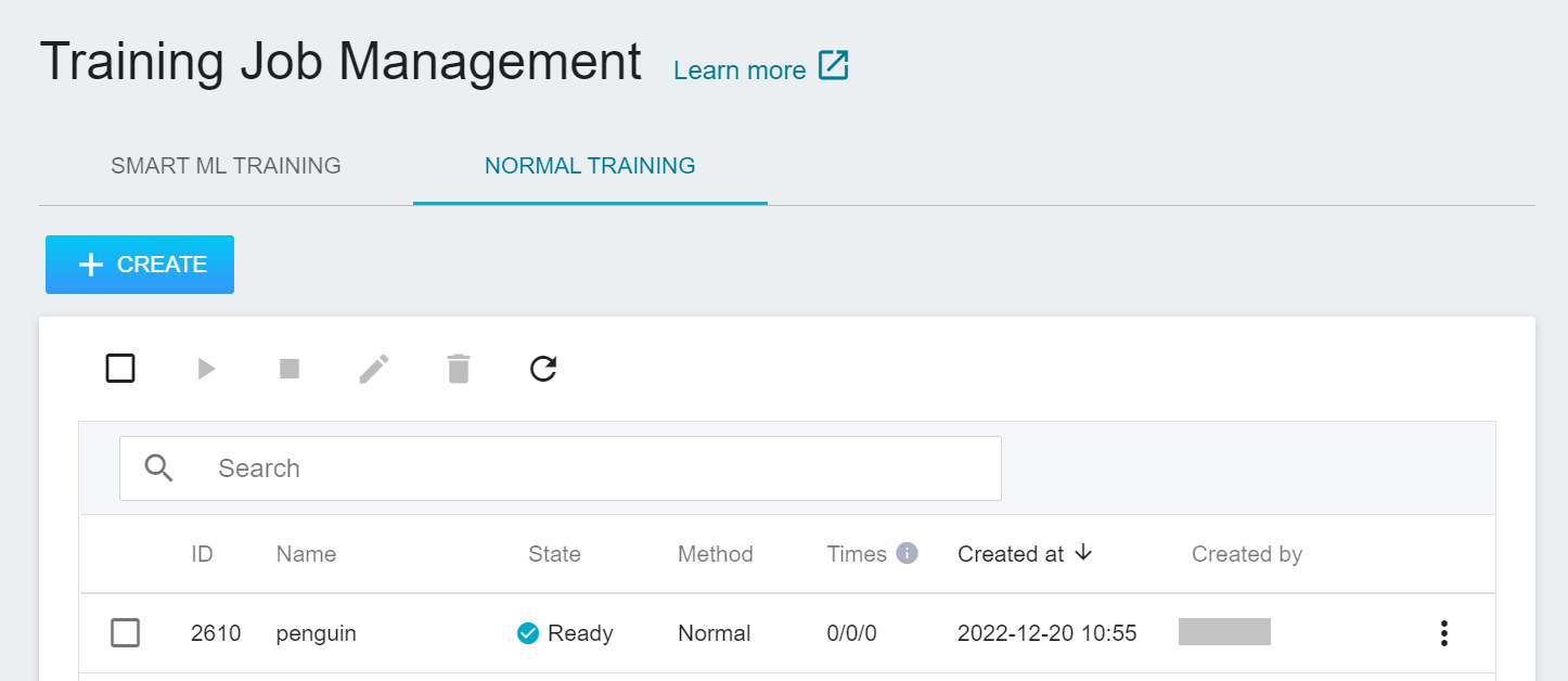 Select **AI Maker** from the OneAI service list, and then click **Training Jobs**. After entering the training job management page, switch to **Normal Training Jobs** tab, then click **+CREATE** to add a training job.
